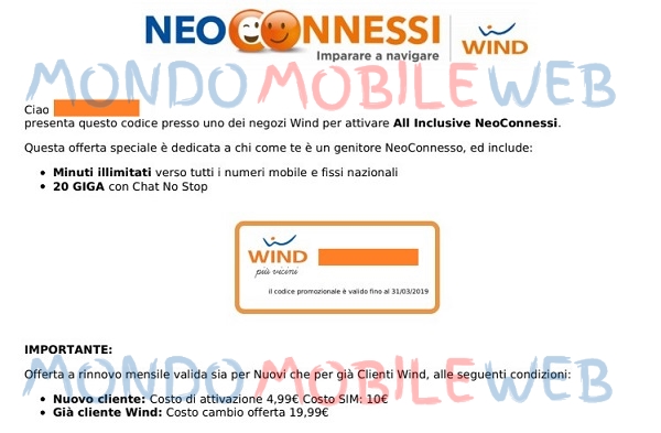 Wind All Inclusive NeoConnessi: 20 Giga e minuti illimitati a 9,99 euro al mese in versione coupon