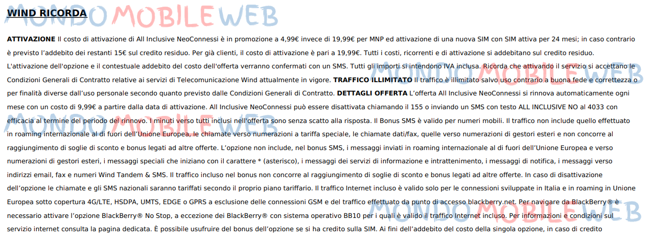 L’offerta non include, nel bonus SMS, i messaggi inviati in roaming internazionale al di fuori dell’Unione Europea e verso numerazioni di gestori esteri, i messaggi speciali che iniziano con il carattere * (asterisco), i messaggi dei servizi di informazione e intrattenimento, i messaggi di notifica, i messaggi verso indirizzi email, fax e numeri Wind Tandem & SMS.