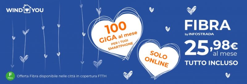 Wind, in occasione dell’imminente ricorrenza di San Valentino, ha lanciato l’iniziativa “Wind Loves You”, che propone alcune offerte speciali per l’occasione. Una di queste è la promozione attivabile online entro il 14 Febbraio 2019, salvo cambiamenti, per le offerte di rete fissa, con il costo del modem e le chiamate illimitate inclusi nel prezzo finale.