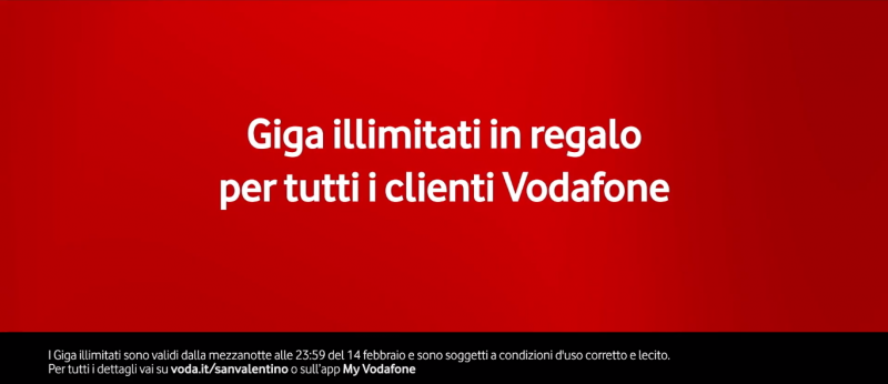 Vodafone, per celebrare San Valentino regalerà, durante tutta la giornata del 14 Febbraio 2019, Giga illimitati a tutti i suoi clienti di rete mobile. Per far conoscere l’iniziativa, l’operatore ha preparato anche un nuovo spot, con protagonista il cantante Fedez, che sarà in onda nelle prossime ore sulle principali emittenti nazionali.
