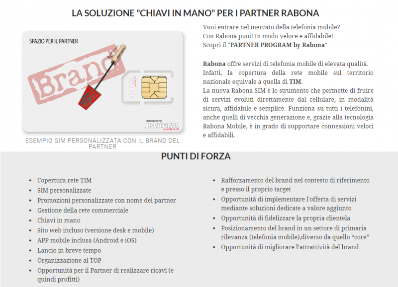 Il Partner Program di Rabona Mobile prevede una soluzione “chiavi in mano” che comprende la personalizzazione della SIM con il marchio del proprio brand, associato al logo “Powered by Rabona Mobile”, e anche la realizzazione di un sito web e di una app mobile dedicati per presentare le offerte.