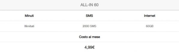 Gli eventi di traffico iniziati durante il giorno di scadenza delle soglie mensili e terminati oltre le ore 24, erodono la soglia se ancora disponibile; in caso di esaurimento della soglia, il traffico effettuato viene tariffato in extrasoglia. I Giga offerti da All-in 60 non includono la navigazione delle pagine App&Store e non abilitano all’utilizzo dei servizi BlackBerry.