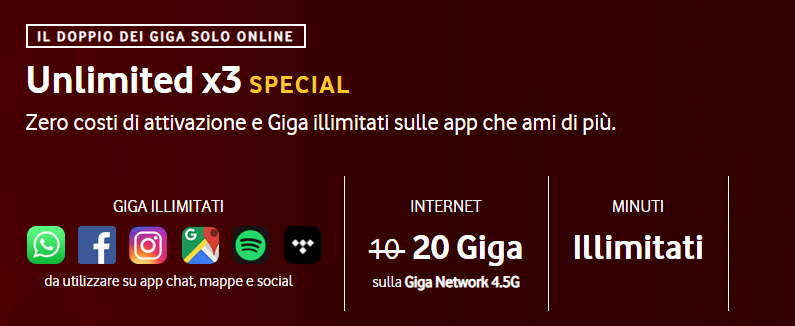 Vodafone Unlimited x3 Special è attivabile nei negozi con Raddoppio Giga e offre minuti illimitati verso tutti, 10 Giga di traffico dati e Giga illimitati per Chat, Mappe e Social con hotspot incluso. L’offerta è dedicata esclusivamente ai nuovi clienti presso i rivenditori Vodafone al costo mensile di 11,99 euro con addebito su carta di credito o conto corrente, oppure di 14,99 euro con addebito su credito residuo, ma in questo caso saranno previsti solo 1000 minuti mensili verso tutti.