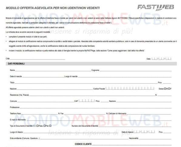 Fastweb informa che la richiesta di applicazione delle agevolazioni economiche può essere presentata successivamente all’attivazione del servizio, che questa verrà gestita entro 30 giorni lavorativi dalla presentazione della domanda completa della documentazione medica richiesta e avrà effetto dal giorno di presentazione della domanda completa e per tutta la durata del rapporto contrattuale.