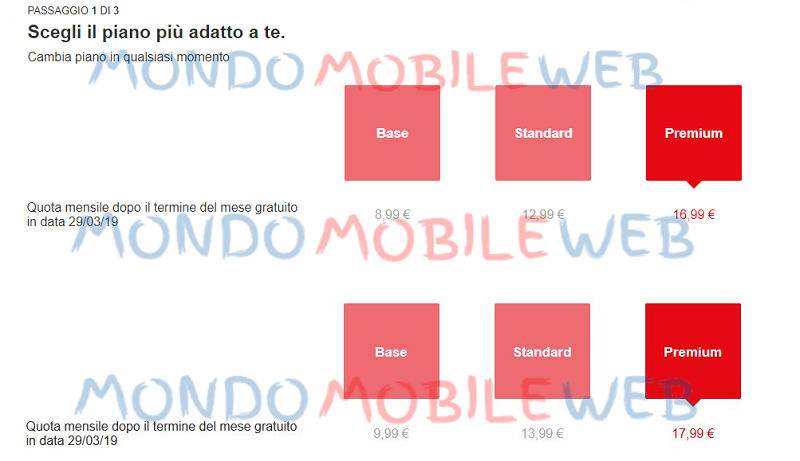 Proprio andando ad attivare la prova gratuita di 30 giorni, alcuni utenti ci hanno segnalato di aver trovato dei prezzi diversi, rispetto a quelli standard, per tutti e 3 gli abbonamenti mensili: Base a 8,99 euro anziché 7,99 euro, Standard a 12,99 euro anziché 10,99 euro e Premium a 16,99 euro anziché 13,99 euro. Altri, invece, ci hanno segnalato un costo mensile aumentato di 2 euro per l’abbonamento Base, 3 euro per il piano Standard e 4 euro per quello Premium rispetto ai prezzi di listino attuali, per un costo mensile rispettivamente di 9,99 euro, 13,99 euro e 17,99 euro.