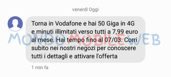 Ecco il testo di uno degli SMS in cui viene proposta la Special Minuti 50 Giga al costo mensile di 8,99 euro: “Torna in Vodafone e hai 50 Giga in 4G e minuti illimitati verso tutti a 8,99 euro al mese. Hai tempo fino al 7 Marzo 2019. Corri subito nei nostri negozi per conoscere tutti i dettagli e attivare l’offerta“. Altri utenti, invece, ci hanno segnalato la ricezione dello stesso identico messaggio con l’unica differenza che il costo mensile proposto è di 7,99 euro.