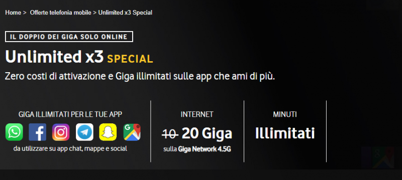 Vodafone, sul suo sito ufficiale, propone già da qualche settimana la promozione dedicata alle nuove attivazioni richieste online dell’offerta Vodafone Unlimited x3 Special, che prevede 20 Giga anziché 10 ogni mese a 11,99 euro al mese (con addebito su carta di credito). Inoltre l’offerta comprende Giga illimitati sulle principali app di Chat, Mappe e Social.
