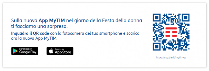 In fondo al sito dedicato, viene menzionata anche una “sorpresa” che sarà disponibile l’8 Marzo 2019, giorno della Festa della Donna, sulla nuova app MyTIM. Per questo motivo sono presenti sia i link che un codice QR per scaricare l’app.