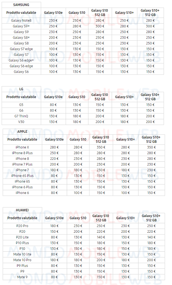 La tabella in foto permette di capire come variano le valutazioni in base all’usato reso al punto vendita. Quindi se, ad esempio, l’utente è in possesso del Huawei P20, quest’ultimo sarà valutato 150 euro acquistando il Samsung Galaxy S10e, 200 euro in caso di acquisto di Galaxy S10 o S10+ da 128GB e 250 euro per S10 o S10+ da 512GB.