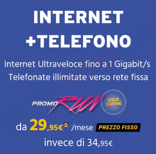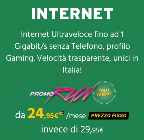 Il prezzo, grazie alla promo online RUN, è di 24,95 euro al mese a tempo indeterminato anziché a 29,95 euro. In caso di attivazione in FTTC Bitstream NGA (BS-NGA), la promo online RUN prevede un costo di 29,95 euro al mese a tempo indeterminato anziché a 34,95 euro al mese.