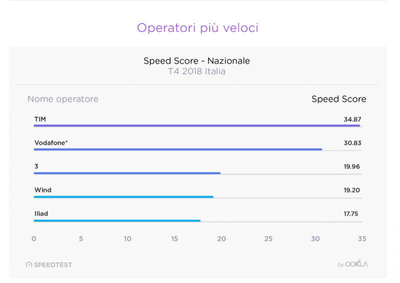 Nel periodo del quarto trimestre 2018, l’operatore italiano più veloce è stato TIM, che ha totalizzato uno Speed Score di 34,87. Vodafone si classifica seconda con 30,83, segue poi Tre con 19,96, Wind a quota 19,20, e infine Iliad con un punteggio di 17,75.