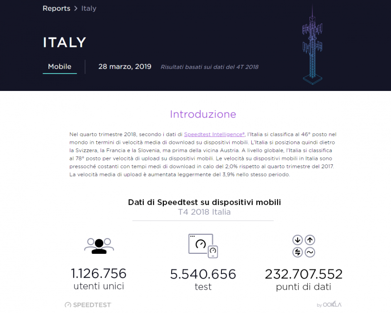 Il report, realizzato sulla base dei dati elaborati da Speedtest Intelligence, è stato pubblicato sul sito di Speedtest.net, nella sezione Report, il 28 Marzo 2019. Come detto, il periodo a cui si riferiscono i test va dal mese di Ottobre al mese di Dicembre 2018.