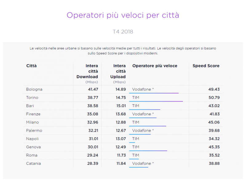 Il report analizza anche quali sono stati i migliori operatori in alcune delle principali aree urbane del Paese. Sono state prese in esame le città di Bari, Bologna, Catania, Firenze, Genova, Milano, Napoli, Palermo, Roma e Torino. Le velocità degli operatori si basano sullo Speed Score per i dispositivi moderni.