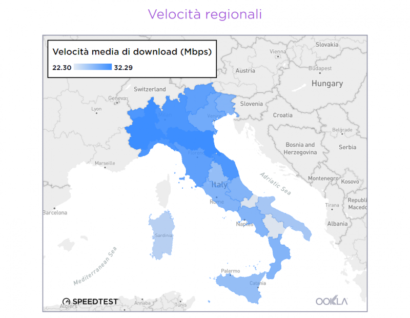 Invece si trova al Sud la regione con la velocità media di download mobile più lenta, la Basilicata, insieme a tre delle altre cinque regioni più lente (Sardegna, Puglia e Sicilia). La seconda regione più lenta per velocità media di download su dispositivi mobili, il Molise, si trova invece in Italia centrale.