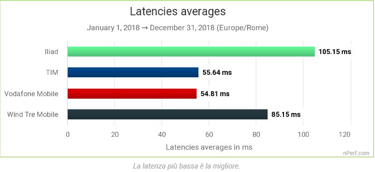Per quanto concerne la latenza media, invece, Vodafone è riuscito a raggiungere TIM, e i due operatori mostrano adesso i risultati migliori. Anche Wind Tre ha mostrato seri margini di miglioramento rispetto al test precedente, mentre Iliad presenta il valore peggiore, con una latenza che supera i 100 ms. In basso, il grafico della latenza. Il valore più elevato indica una latenza maggiore e dunque una condizione meno felice per gli utenti.