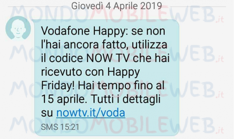 Adesso, questa pagina è stata aggiornata e inoltre i clienti Vodafone Happy che non avevano ancora utilizzato il proprio codice entro il 31 Marzo 2019 hanno ricevuto in questi giorni un SMS che li avvisa della proroga della validità del coupon. Ecco il testo del messaggio:
