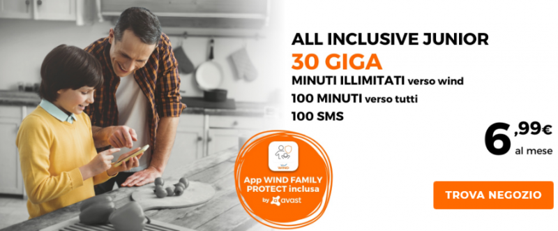 La All Inclusive Junior prevede 30 Giga in 4G, minuti illimitati verso Wind100 minuti e 100 SMS al costo di 6,99 euro al mese con l’app Wind Family Protect Inclusa gratuitamente.