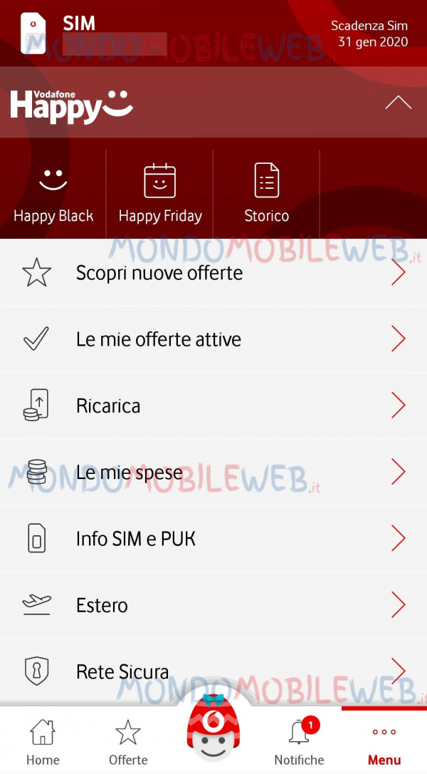 Una volta cliccato sul tasto “Menu”, si apriranno tutte le voci, identiche a quelle dell’ultima versione, con la differenza che adesso viene messa in evidenza, in alto, la voce dedicata a Vodafone Happy, grazie al quale è possibile accedere alle sottosezioni di Happy Black, Happy Friday e lo Storico, con tutti i premi e i codici riscattati precedentemente.
