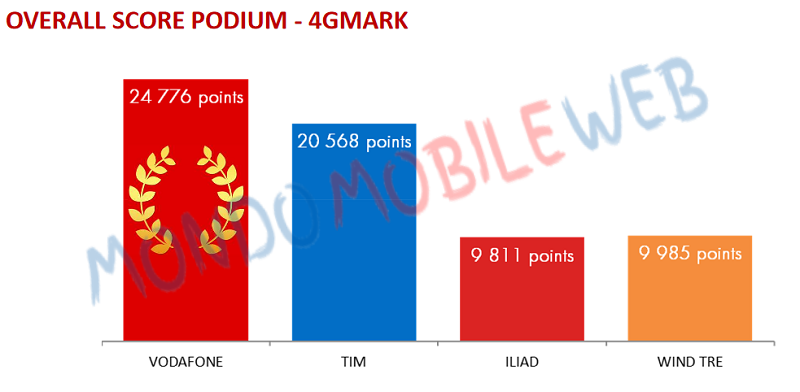 Dall’analisi dei dati raccolti nel periodo di riferimento, che va dal mese di Gennaio a Marzo 2019, Vodafone ha ottenuto un punteggio complessivo di 24.776 points, seguono TIM con 20.568 points, Wind Tre con 9.985 points, ultimo iliad con 9.811 points. I punti distribuiti da 4G Mark vengono assegnati in base ad una formula che tiene conto sia della velocità che della qualità della rete.