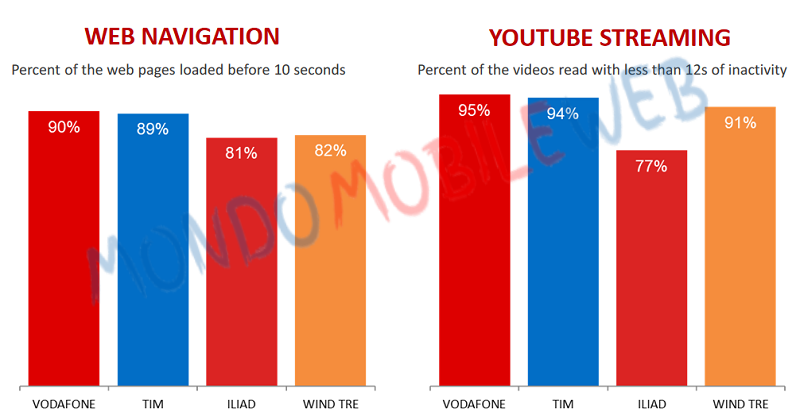 Secondo quanto affermato dal report 4G Mark, inoltre, Vodafone ha fornito la migliore performance in termini di navigazione web, con il 90% (89% TIM, 82% Wind Tre e 81% iliad) di pagine caricate prima dei 10 secondi, e di YouTube streaming con una percentuale del 95% (94% TIM, 91% Wind Tre e 77% iliad) di video riprodotti con meno di 12 secondi di inattività.