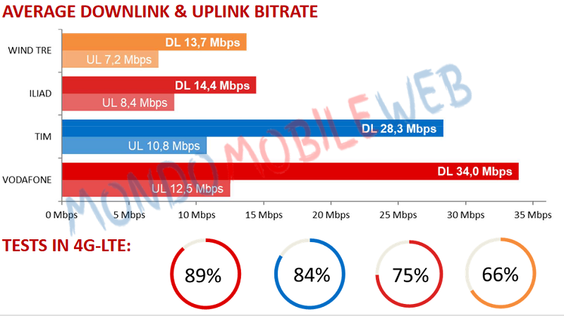 Come si evince dal grafico, Vodafone è risultato l’operatore con la migliore copertura in Italia con l’89% dei test eseguiti su questa tecnologia, segue TIM con 84%, iliad con 75% e Wind Tre con 66%.