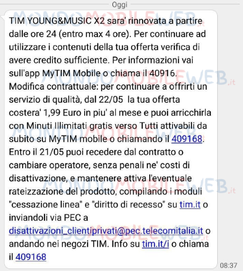 Ecco il messaggio inviato: “Tim Young&Music x2 sarà rinnovata a partire dalle ore 24 (entro max 4 ore). Per continuare ad utilizzare i contenuti della tua offerta verifica di avere credito sufficiente. Per informazioni vai sull’app MyTIM Mobile o chiama il 40916. Modifica contrattuale: per continuare a offrirti un servizio di qualità, dal 22/05 la tua offerta costerà 1,99 euro in più al mese e puoi arricchirla con Minuti Illimitati gratis verso Tutti attivabili da subito su MyTIM Mobile o chiamando il 409168. Entro il 21/05 puoi recedere dal contratto o cambiare operatore, senza penali nè costi di disattivaizone, e mantenere attiva l’eventuale rateizzazione del prodotto, compilando i moduli “cessazione linea” e “diritto di recesso” su tim.it o inviandoli via PEC a disattivazioni_clientiprivati@pec.telecomitalia.it o andando nei Negozi TIM. Info su tim.it/i o chiama il 409168“.