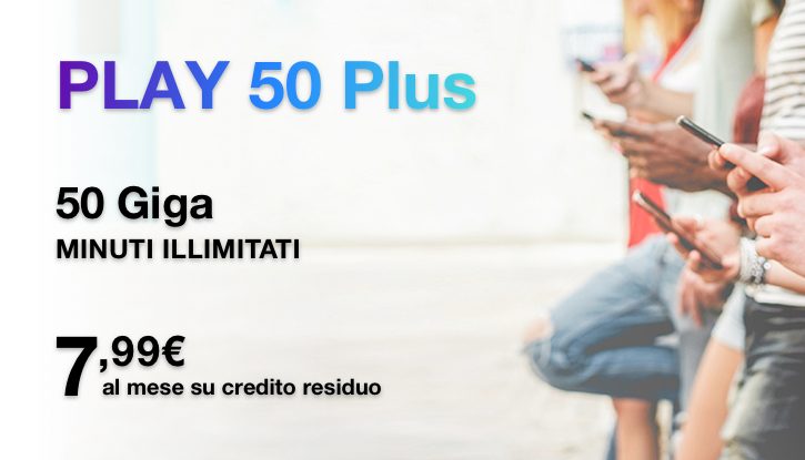 OFFERTA SPECIALE solo per te! 50 GIGA e MINUTI ILLIMITATI a 7,99 euro al mese. Corri nei 3Store fino al 26 Aprile 2019 per attivare Play 50 Plus. Info su: tre.it/play50plus