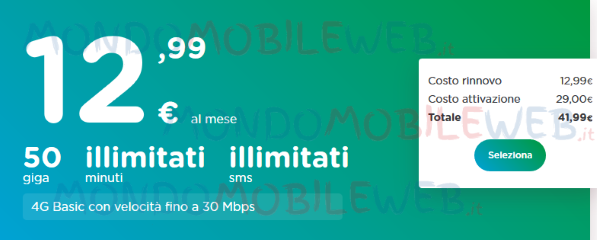 L’offerta prevede ogni mese minuti illimitati verso tutti i numeri nazionali di rete mobile e rete fissa, sms illimitati verso tutti i numeri di rete mobile e rete fissa e 50 Giga di traffico internet 4G con velocità fino a 30 Mbps in download. Con lo stesso bundle dati è possibile navigare anche in 2G e 3G.