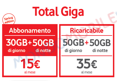 La Total Giga, invece, prevede 50 Giga da utilizzare durante il giorno e 50 Giga di notte (dalle ore 00:00 alle 08:00), con due contatori separati, al costo mensile di 30 euro in versione abbonamento e 35 euro in versione ricaricabile.