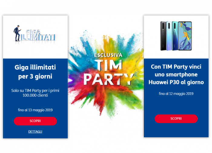 Nella pagina viene pubblicizzata un’altra iniziativa per i clienti TIM Party, già attiva dal 29 Aprile 2019: si tratta del concorso a premi che mette in palio uno smartphone Huawei P30 al giorno fino al 12 Maggio 2019, tramite meccanismo di istant win. Per maggiori informazioni su questa iniziativa si si invita a consultare l’approfondimento dedicato.