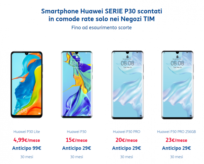 A proposito di smartphone Huawei, per tutti i clienti TIM sarà possibile acquistare a rate in negozio, fino ad esaurimento scorte, i seguenti smartphone della nuova gamma P30: Huawei P30 Lite a 4,99 euro al mese per 30 mesi più un anticipo di 99 euro, per un totale di 248,70 euro; Huawei P30 a 15 euro al mese per 30 mesi più un anticipo di 29 euro, per un totale di 479 euro; Huawei P30 Pro a 20 euro al mese per 30 mesi più un anticipo di 29 euro, per un totale di 629 euro; Huawei P30 Pro 256GB a 23 euro al mese per 30 mesi più un anticipo di 29 euro, per un totale di 719 euro.
