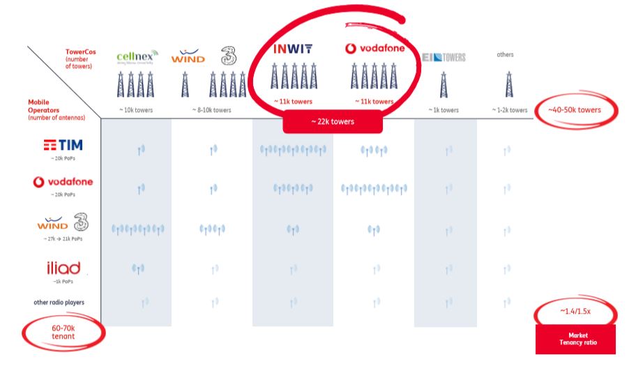 In Italia, con l’accordo tra TIM e Vodafone, la nuova entità avrà a disposizione circa 22.000 torri, contro le 10.000 di Cellnex e le 8000/10.000 di Wind Tre. In basso, il grafico presentato da Inwit che riassume la situazione del mercato delle torri in Italia, con riferimento anche all’accordo tra TIM e Vodafone.