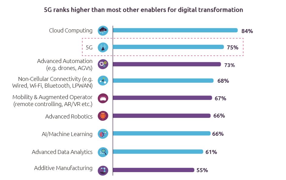Secondo lo studio di Capgemini, il 65% delle grandi aziende attende con impazienza di poter implementare il 5G nei loro processi. Inoltre, il 75% dell’industria ritiene che il 5G sarà un fattore critico per la loro trasformazione digitale. Secondo quanto riportato, infatti, il 5G è considerato come il secondo key enabler della digitalizzazione, secondo solo al cloud computing.