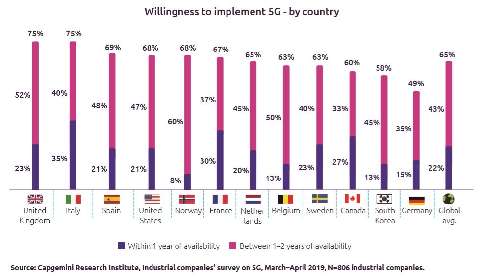 Infatti, secondo il grafico di Capgemini, il 75% delle aziende italiane ha intenzione di sfruttare la rete 5G, e il 35% vorrà farlo entro il primo anno di disponibilità commerciale; si tratta del valore più elevato nel grafico presentato, riportato in basso.