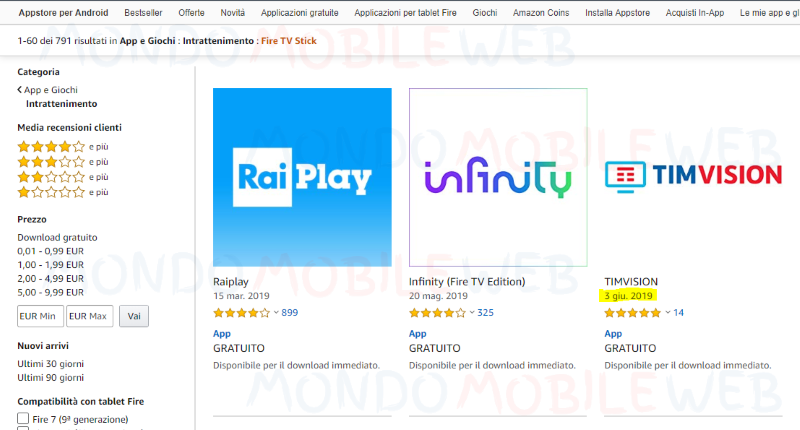 Per quanto riguarda invece l’app store di Amazon, TIM ha aggiunto a partire dal 3 Giugno 2019 la sua applicazione di TIMVISION anche sul catalogo delle app del celebre sito di e-commerce.