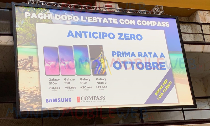 In più, tutti i nuovi e già clienti Tre potranno acquistare, con anticipo zero e prima rata ad Ottobre 2019, il Samsung Galaxy S10e a 10,99 euro, il Samsung Galaxy S10 a 15,99 euro al mese, il Galaxy S10+ a 20,99 euro al mese ed il Galaxy Note 9 a 22,99 euro al mese tramite pagamento con finanziamento Compass. Quest’ultimo permetterà anche di acquistare alcuni smartphone, come Huawei P Smart Z o Samsung Galaxy A40, ad anticipo zero e rata zero con le offerte All-In.