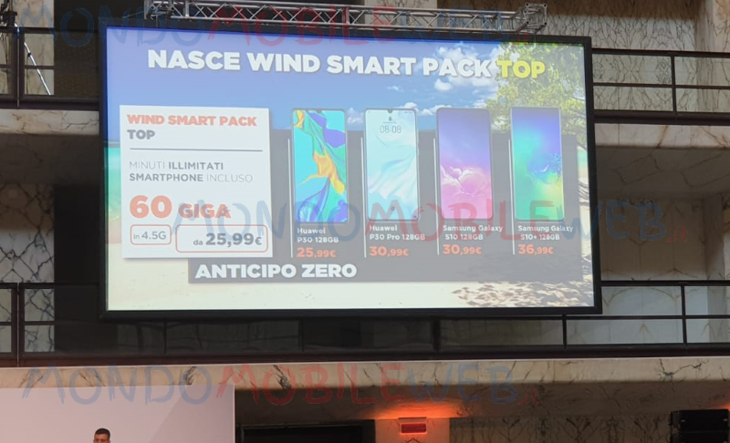 Nei prossimi giorni sarà introdotta la Wind Smart Pack Top che, al contrario dell’attuale pacchetto, offrirà minuti illimitati, smartphone incluso e 60 Giga in 4.5G a partire da 25,99 euro al mese con anticipo zero. Sarà possibile scegliere tra diversi smartphone top di gamma tra cui Huawei P30 128GB a 25,99 euro al mese, Samsung Galaxy S10+ 128GB a 36,99 euro al mese, ma anche il Huawei P30 Pro 128GB o Samsung Galaxy S10 128GB al costo mensile di 30,99 euro. Il canone mensile prevederà non solo le rate dello smartphone scelto, ma anche minuti illimitati e 60 Giga in 4.5G.