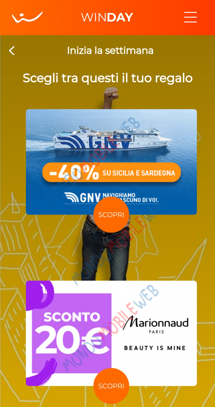 Nella giornata di oggi, Lunedì 17 Giugno 2019, il programma di fedeltà WinDay ha riservato per i clienti Wind uno sconto per un viaggio con GNV in Sicilia e Sardegna o un coupon nelle profumerie e nel sito Marionnaud.