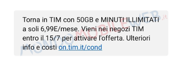 “Torna in TIM con 50GB e Minuti Illimitati a soli 6,99 euro al mese. Vieni nei negozi TIM entro il 15 Luglio 2019 per attivare l’offerta. Ulteriori info e costi on.tim.it/cond”.