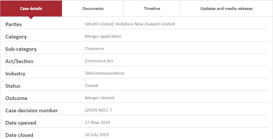 Adesso, dopo oltre un mese di studio, la Commissione ha aggiornato il suo registro dichiarando chiusa l’indagine e autorizzando l’acquisizione del 50% del capitale di Vodafone New Zealand Limited.