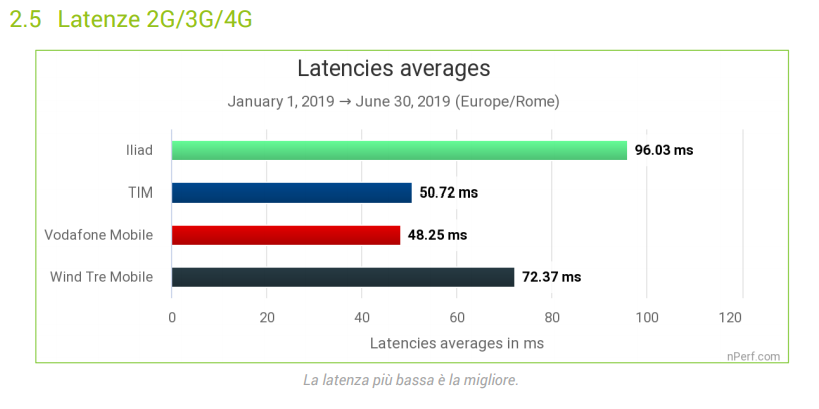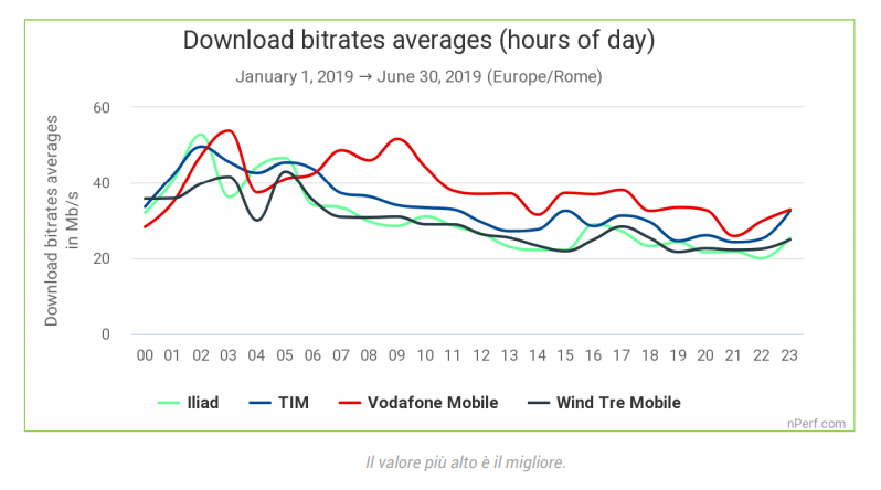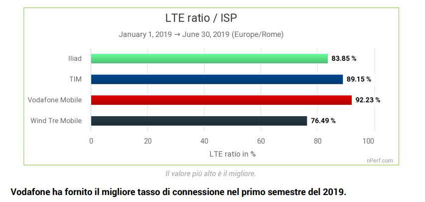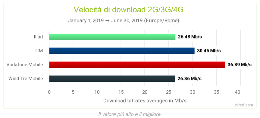 nPerf, società che valuta le connessioni di rete mobile tramite gli speedtest effettuati dalla sua app, ha pubblicato un nuovo Barometro delle connessioni mobili in Italia, relativo al primo semestre del 2019. I risultati continuano a premiare Vodafone con TIM che segue a poca distanza, mentre si registra un buon miglioramento di Iliad che riesce anche a superare di pochissimo Wind Tre nelle velocità medie.