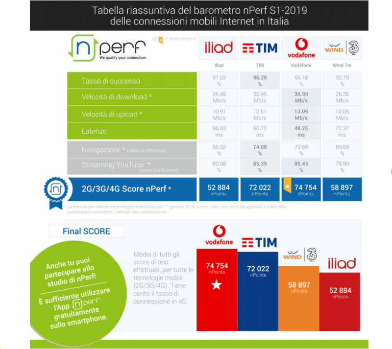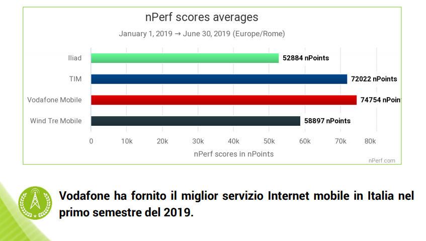 Sommando tutti questi risultati, si ottiene lo Score nPerf, che premia Vodafone come miglior operatore per il primo semestre del 2019 con 74.754 nPoints. Al secondo posto si piazza TIM con 72.022 nPoints, al terso posto Wind Tre con 58.897 nPoints e infine Iliad con 52.884 nPoints.