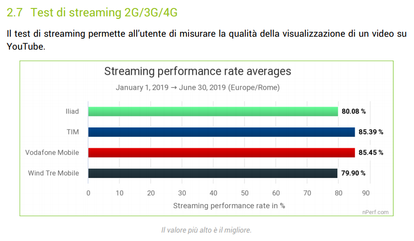 Nel corso di questi primi 6 mesi del 2019 si evidenzia un netto miglioramento di Iliad per quanto riguarda il test di streaming, e da Giugno 2019 ha recuperato terreno rispetto a TIM e Vodafone.