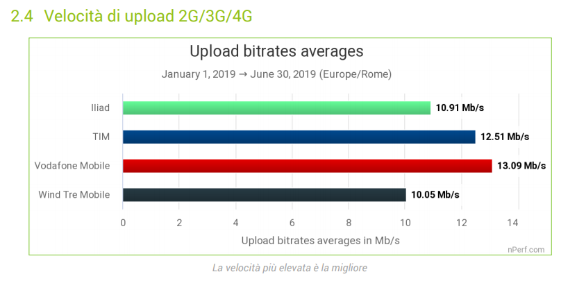 Nelle velocità di upload Vodafone si piazza al primo posto facendo registrare una velocità media di 13,09 Mbps, segue TIM con 12,51 Mbps, mentre Iliad è al terzo posto con 10,91 Mbps e Wind Tre in fondo alla classifica con 10,95 Mbps.