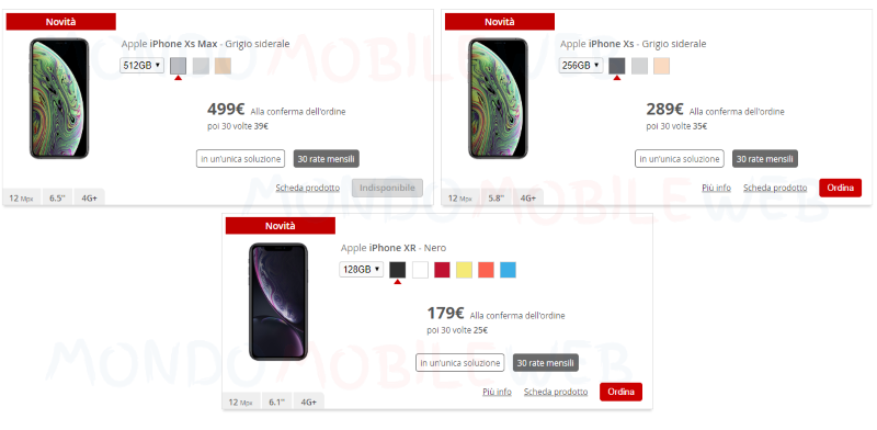 - Apple iPhone XS Max 512GB con anticipo di 499 euro e 30 rate mensili da 39 euro;