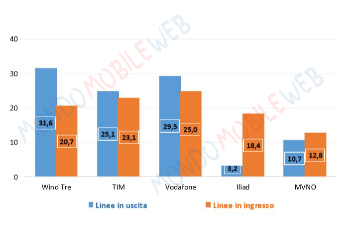 Il saldo tra operazioni recipient e donating (dunque, il saldo netto di portabilità) negli ultimi dodici mesi risulta negativo per Wind Tre, che perde 1,796 milioni di clienti, per Vodafone, che perde 726.000 clienti e per TIM, con meno 317.000 clienti. Essenzialmente, le portabilità negative per i tre principali operatori vanno a favore di Iliad. In basso, un grafico dedicato.