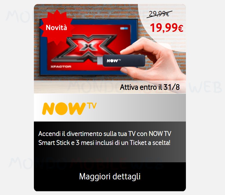 Per quanto riguarda il nuovo vantaggio NOW TV, questo consiste nell’acquisto della chiavetta HDMI NOW TV Smart Stick con 3 mesi di visione di un Ticket a scelta inclusa al costo di 19,99 euro anziché a 29,99 euro.