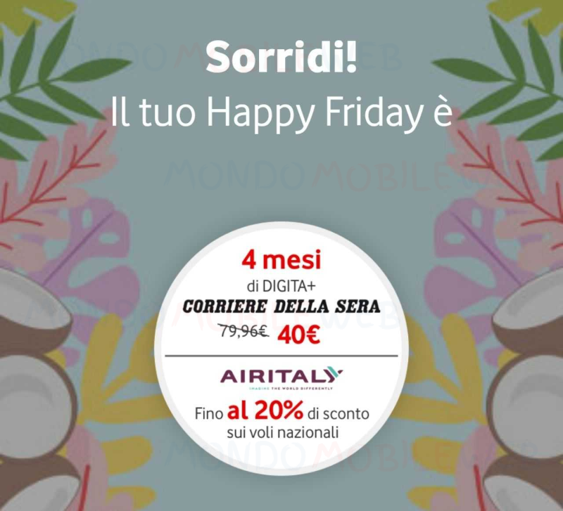 Come anticipato da MondoMobileWeb, entro le 23:59 sarà possibile riscattare tramite l’app My Vodafone il regalo odierno, che in questo caso è un doppio vantaggio consistente in uno sconto con la compagnia aerea Air Italy del 20% sui voli da e per la Sardegna e del 15% sui voli per tutte le altre destinazioni nazionali, e anche 4 mesi di abbonamento digitale Digita+ del Corriere della Sera a 40 euro anziché a 79,96 euro.