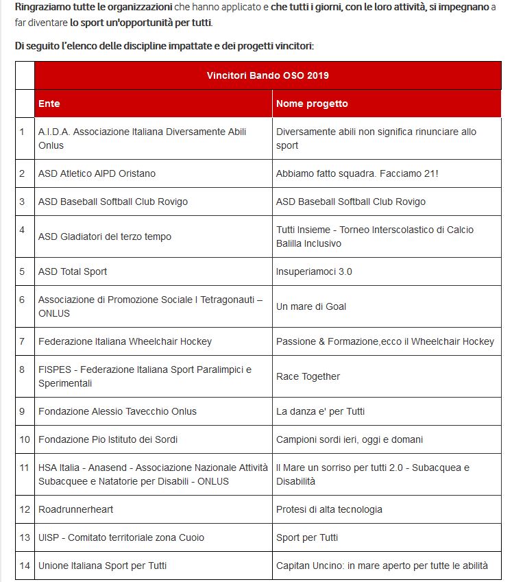 Al termine della gara, sono stati selezionati 14 progetti proposti da enti diversi, come l’ASD Total Sport, la Federazione Italiana Wheelchair Hockey, la Fondazione Alessio Tavecchio e la Fondazione Pio Istituto dei Sordi. I progetti, seguendo il tema dell’integrazione nello sport, abbracciano discipline come la corsa, la danza, l’hockey, il baseball e il nuoto.