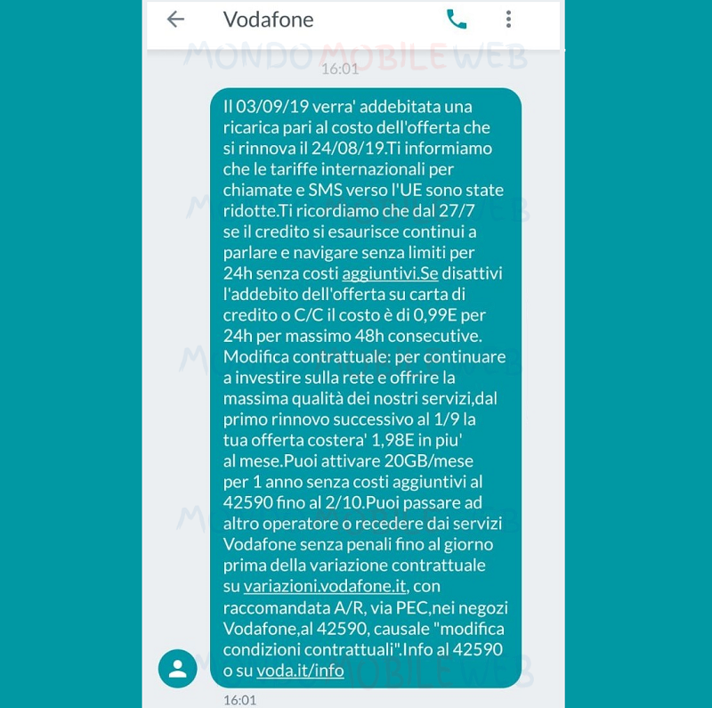 Vodafone ha informato i clienti impattati tramite apposita comunicazione chiamando il numero gratuito 42590 oppure per mezzo di SMS informativi, accorpando l’avviso della rimodulazione con quello del rinnovo della proprio offerta e giustificando l’aumento per continuare a investire sulla rete e offrire la massima qualità dei servizi.